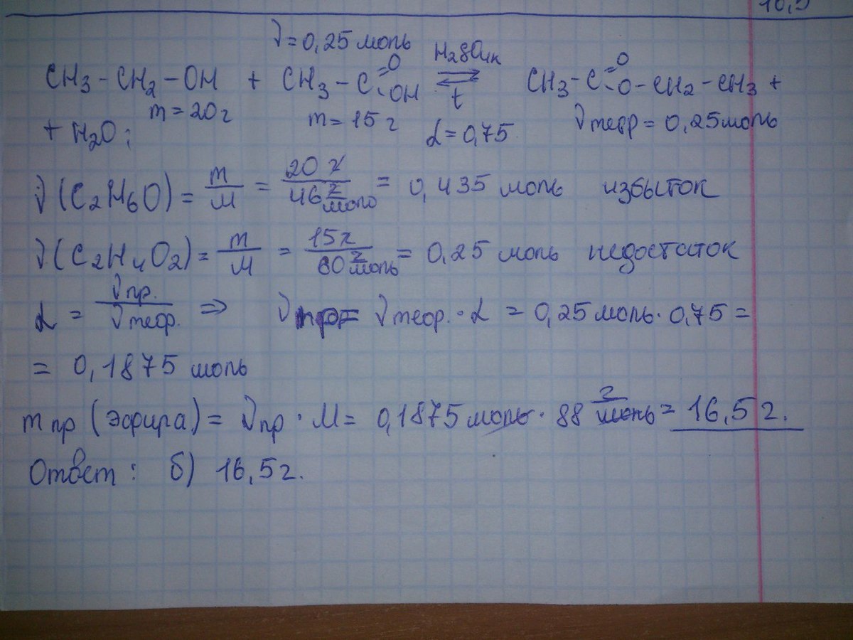 масса этилацетата (в г.) ,полученного из 15 г уксусной кислоты и 20 г этанола (выход эфира 75%), равна: