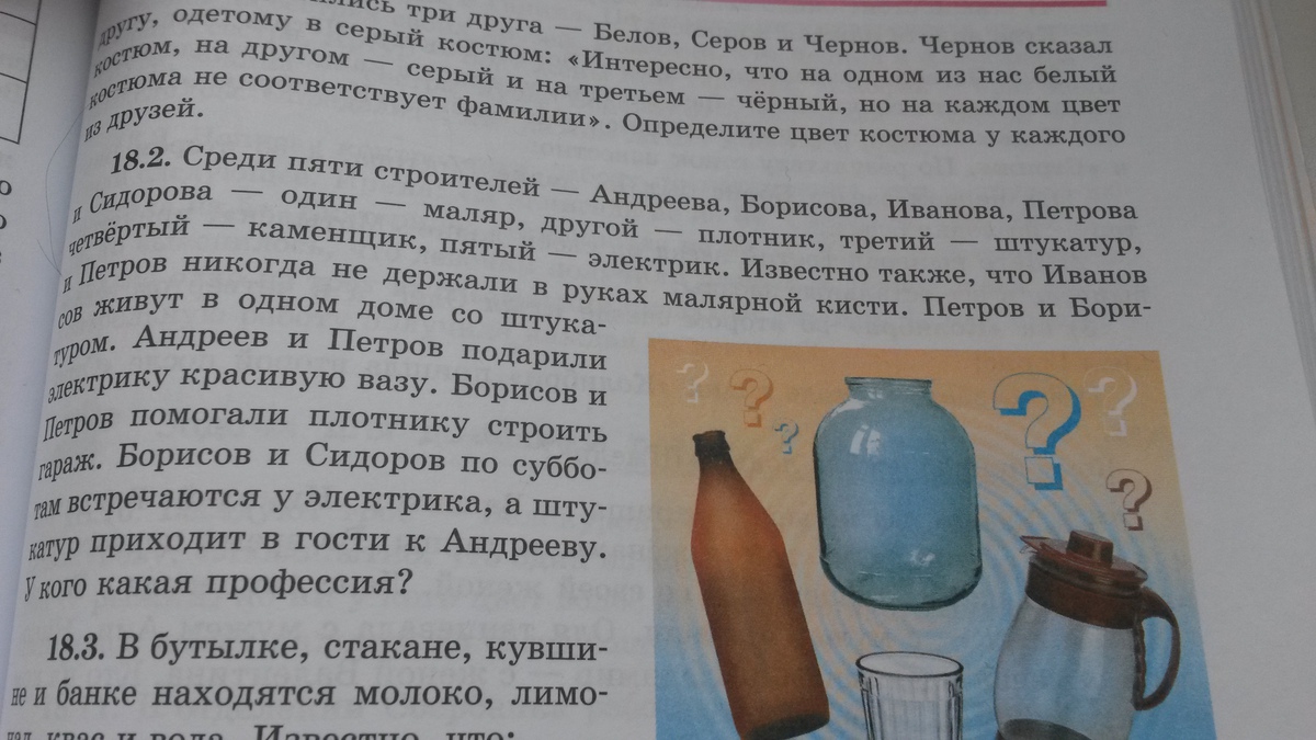 Рисуем таблицу - вверху фамилии, сбоку профессии. И по ходу условия ставим минусы кому не подходит, и ели кого то находим точно - значит остальным что не их професия. Потом логически как клубочек все вырисовывается: