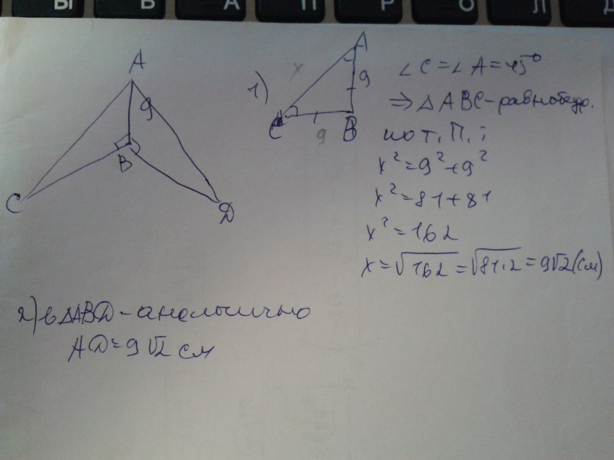 расстояние 9 см, проведены к ней две наклонные под углом 45. найдите длинны наклонных. Надо решить с рисунком, помогите пожалуйста
