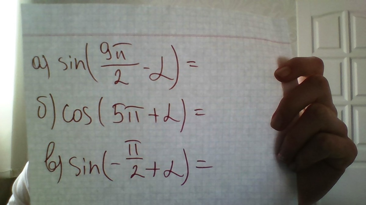 Если в скобке стоит угол вертикального диаметра единичной окружности (9/2 пи, пи/2), то название функции меняется на кофункцию (синус на косинус и наоборот), если в скобке стоит угол горизонтального диаметра един. окружности (5 пи), то название функции остаётся прежним. Ну, а знак смотри по четвертям.