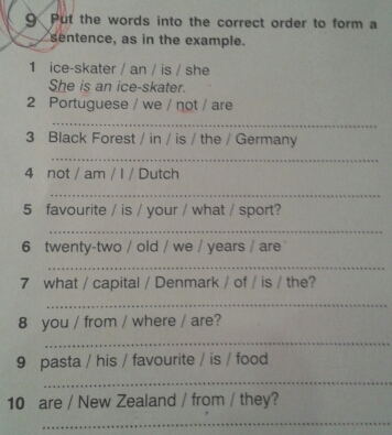 We are not Portuguese. The black Forest is in Germany. I am not Dutch. What is your favorite sport? We are twenty-two years old. what is the capital of Denmark? Where are you from?Pasta is his favorite food.Are they from New Zealand?
