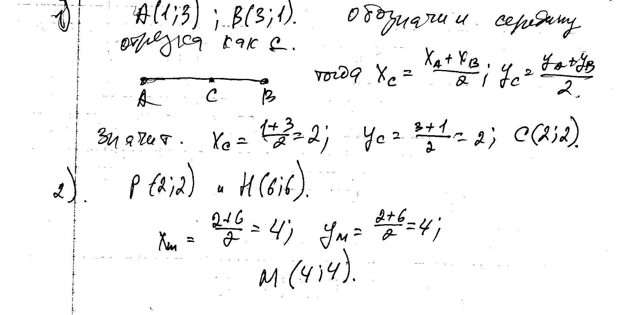 2)Даны точки Р(2;2) и Н(6;6).Найдите координаты точки М,делящей отрезок РН пополам