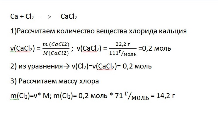 ca+cl2=cacl2 над хлором х под ним 71г над хлоридом кальция 22ю2 г под ним 111 в итоге получается пропорция х=(71*22.2)/111=14.2