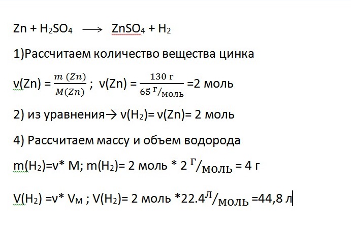 найти массу и объем водорода, полученного при взаимодействии цинка с серной кислотой, масса цинка=130г