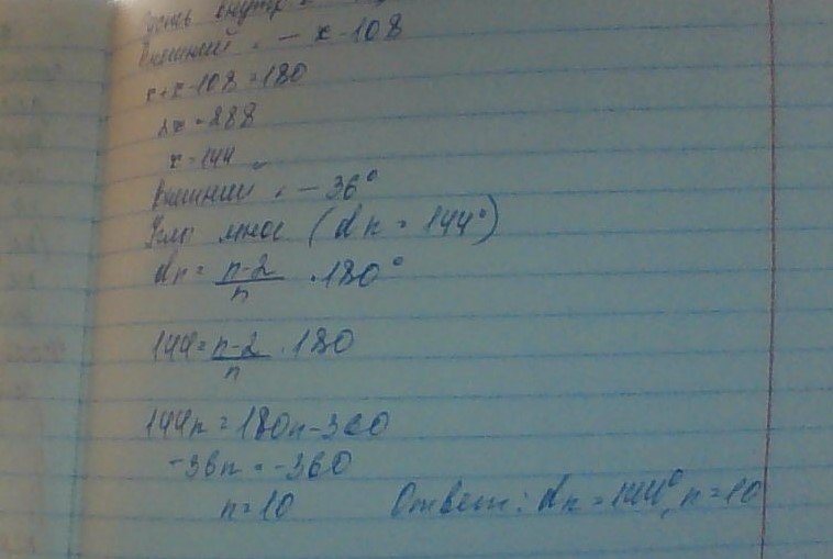 Внешний угол правильного многоугольника на 108 градусов меньше его угла. Найдите углы и количество сторон данного многоугольника.