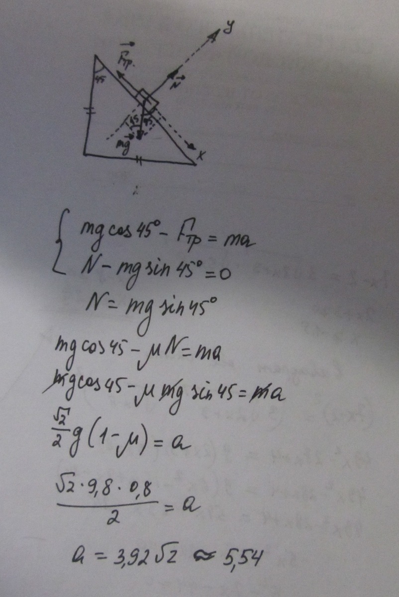Помогите) Вычислить ускорение тела, которое скользит по наклонной плоскости, если высота и длина одинаковые, а коэффициент трения равен 0,2??