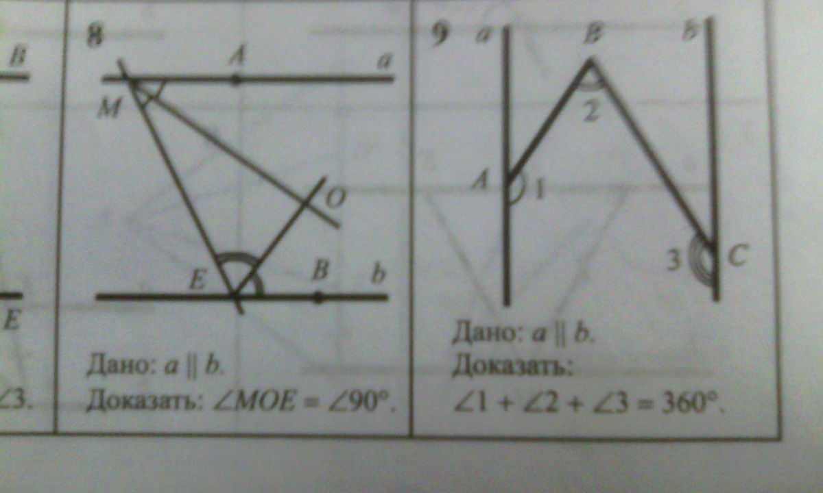 если через точку В провести третью параллельную прямую, то угол 2 разобъется на два угла. левый будет равен смежному с углом 1(обозначим его 4),т.к. они внутренние накрестлежащие, а правый = смежному с углом 3(обозначим его 5), т.к. они вн. накрестлежащие, т.о. 1+2+3=1+смежный с ним(4)+3+смежный с ним(5)=(1+4)+(3+5)=180+180=360