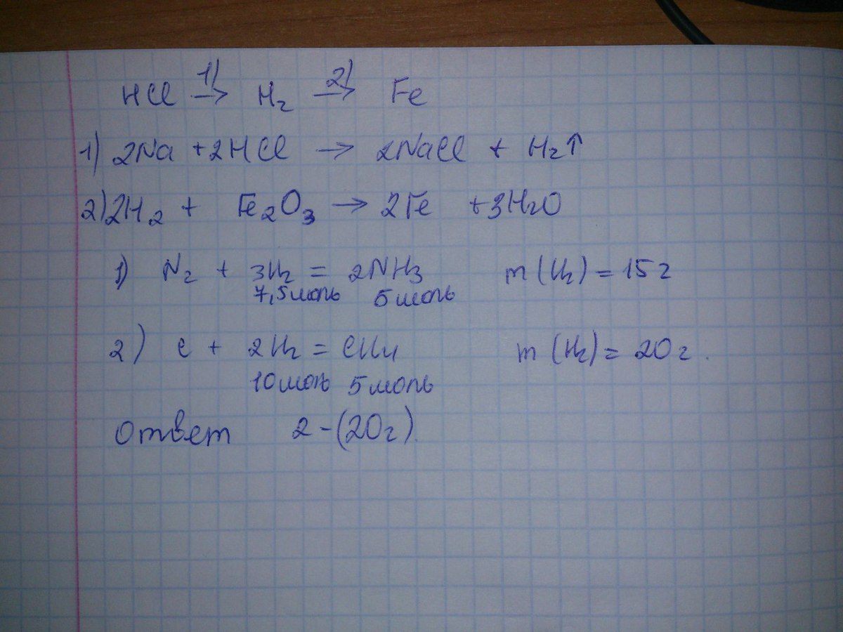В каком случае для получения 5 моль продукта потребуется большая масса водорода:1)N2+3H2=2NH3 или 2)C+2H2=CH4