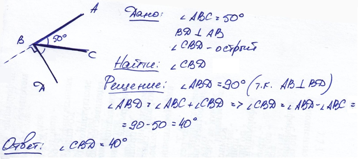 Постройте угол АВС, градусная мера которого равна 50 градусов. К стороне АВ проведите перпендикулятор ВD так, чтобы угол СВD был острый. Найдите градусную меру угла СВD.