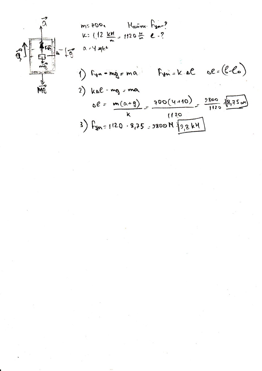 Лифт поднимается вверх с ускорением 4м/c2. В лифте на пружине жесткостью 1,12кН/м висит груз массой 700г. Какова сила упругости пружины? На сколько см изменилась длина пружины?