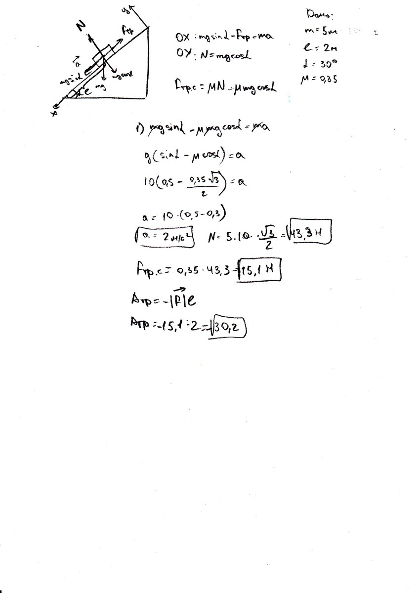 тело массой 5 кг соскользнуло с наклонной плоскости длиной 2 м. Найдите работы силы тяжести, силы реакции опоры и силы трения. Угол наклона плоскости 30 градусов, коэффициент трения 0,35