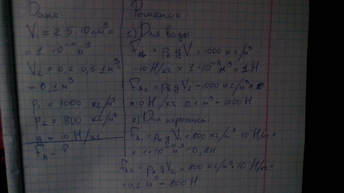ПОМОГИТЕ РЕШИТЬ ЗАДАЧУ:Один брусок имеет размер 2 x 5 x 10 см, а соответствующий размер другого бруска в 10 раз больше (0,2 x 0,5 x и 1 м). Вычислите, чему будут равны архимедовы силы, действующие на эти бруски при полном погружении их в пресную воду, в керосин.