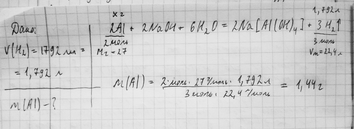 Визначте масу алюмінію,який розчинили в розчині натрій гідроксиду,якщо виділилось 1792 мл водню(н.у.).