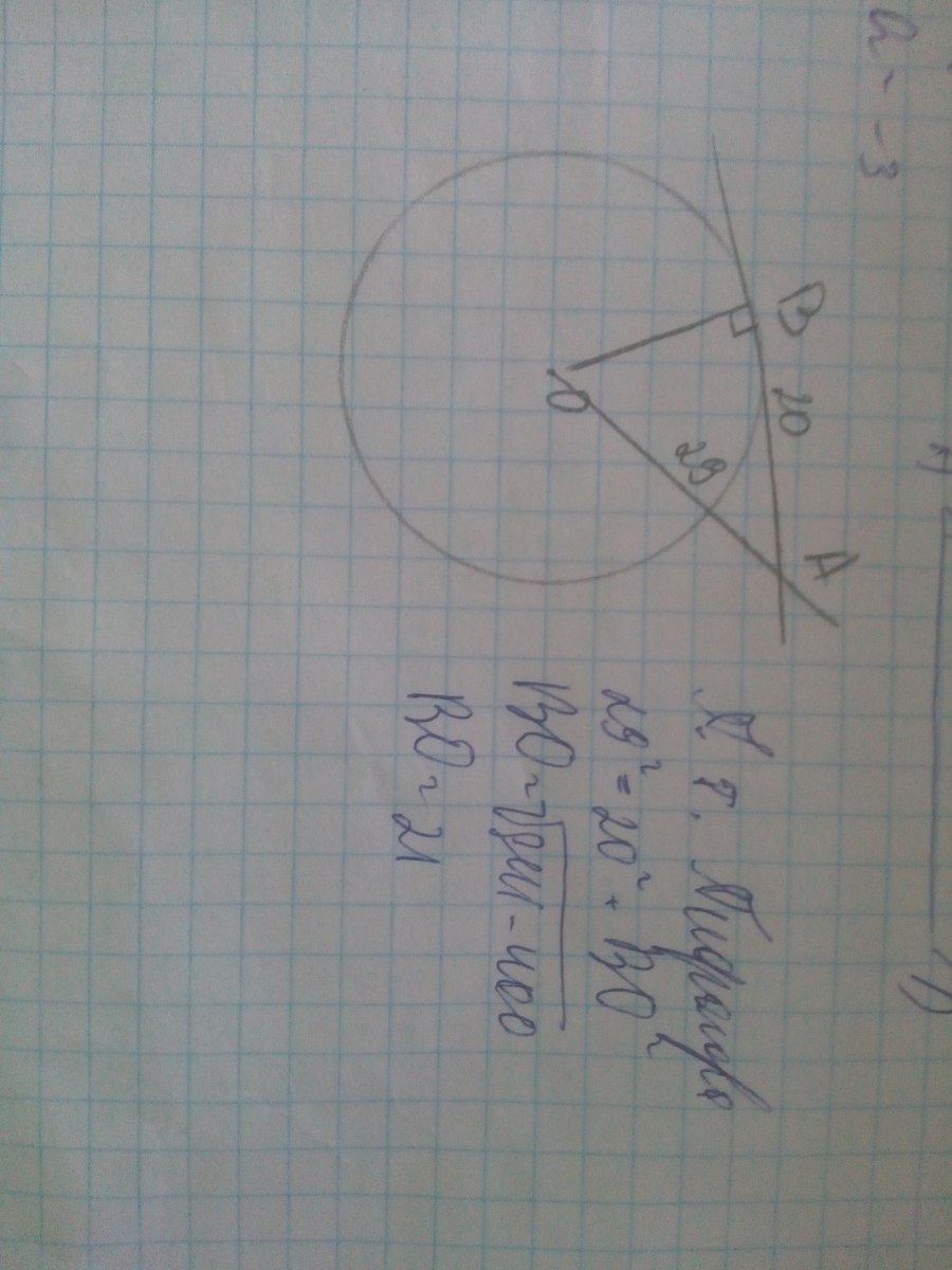 рассмотрим треугольник АОВ. АВ-кассательная, ОВ-радиус, следовательно, АВ перпендикулярно ОВ. поэтому треугольник АОВ прямоугольный. найдем радиус по Т.Пифагора: ВО=корень изАО^2-AB^2=корень из 441=21