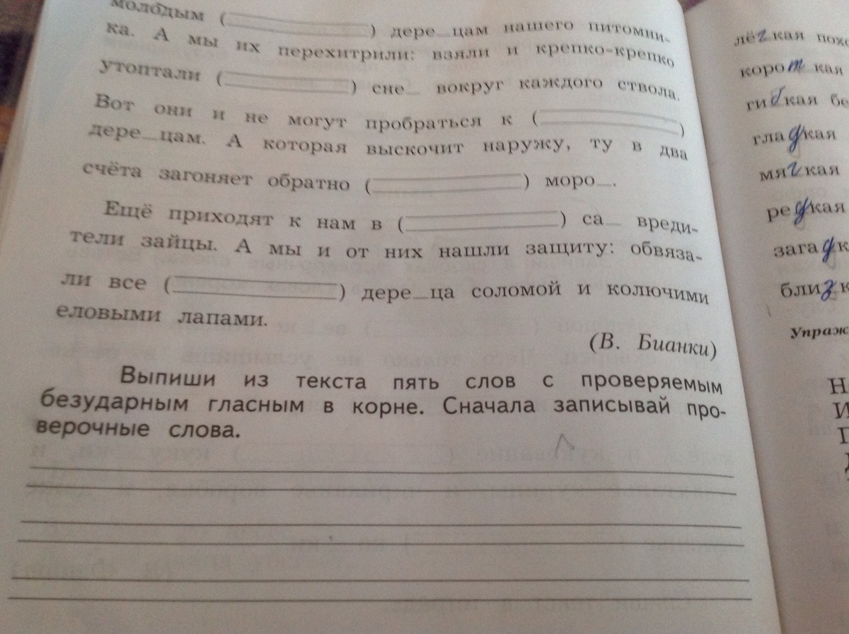 Выпал сильный (снега) снег (∩ снег). Обнаружено, что мыши повели в нем (подкопы) подкоп (∩ коп) к молодым (дерево) деревцам (∩ дерев) нашего питомника. А мы их перехитрили: взяли и крепко крепко утоптали (снега) снег (∩ снег) вокруг каждого ствола. Вот они и не могут пробраться к (дерево) деревцам (∩ дерев). А которая выскочит наружу, ту в два счета загоняет обратно (морозы) мороз (∩ мороз).