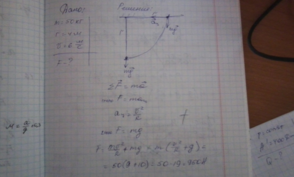 Мальчик массой 50 кг качается на качелях с длинной подвеса 4 метра. С какой силой он давит на сиденье при прохождении среднего положения со скоростью 6 м/с? Пожалуйста напишите решение. Заранее Спасибо!