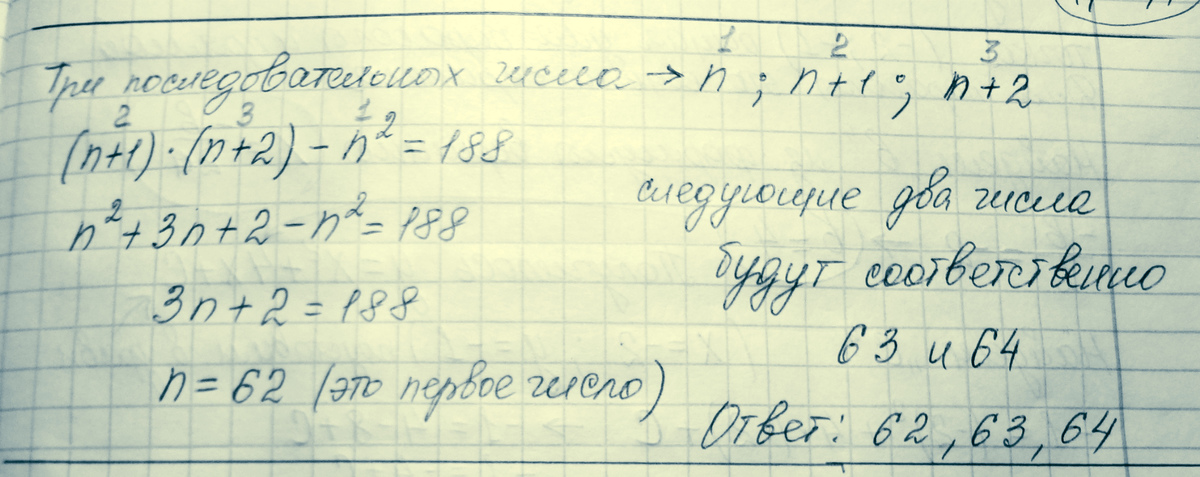 Найдите три последовательных натуральных числа, зная, что если из произведения двух больших чисел вычесь квадрат меньшего числа, то получится 188