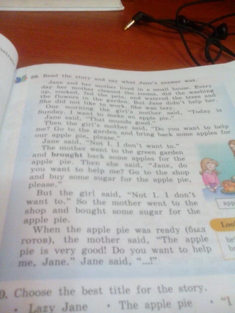 По-моему она согласилась в конце. Лучший заголовок для рассказа будет "The apple pie" и Джейн не хотела помогать маме, потому что она была ленивая (She was lazy).