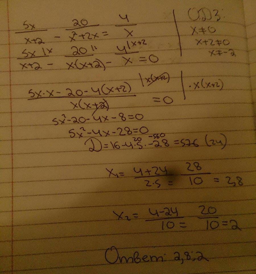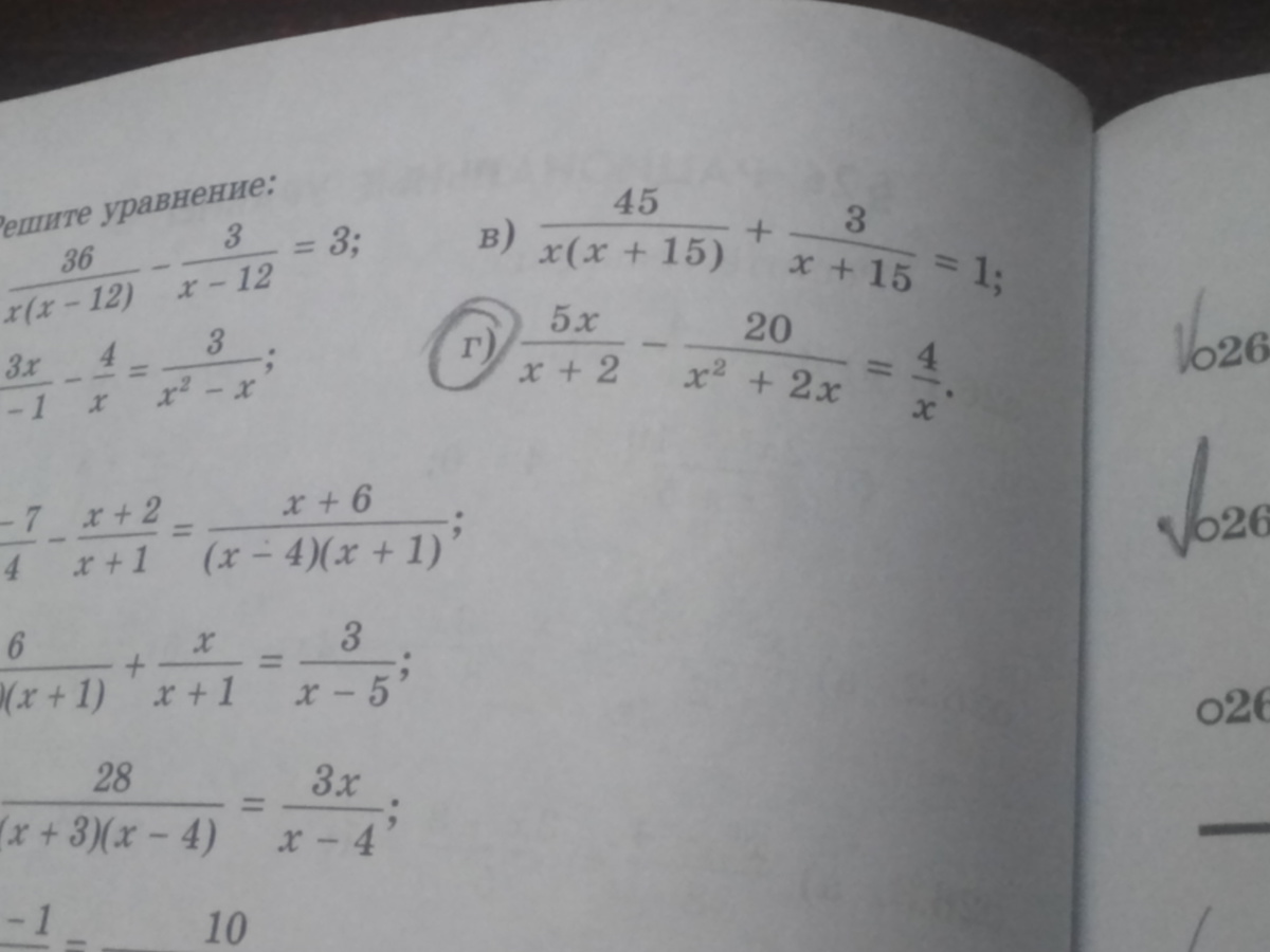 г) 5x/(x + 2) - 20/(x^2 + 2x) = 4/x