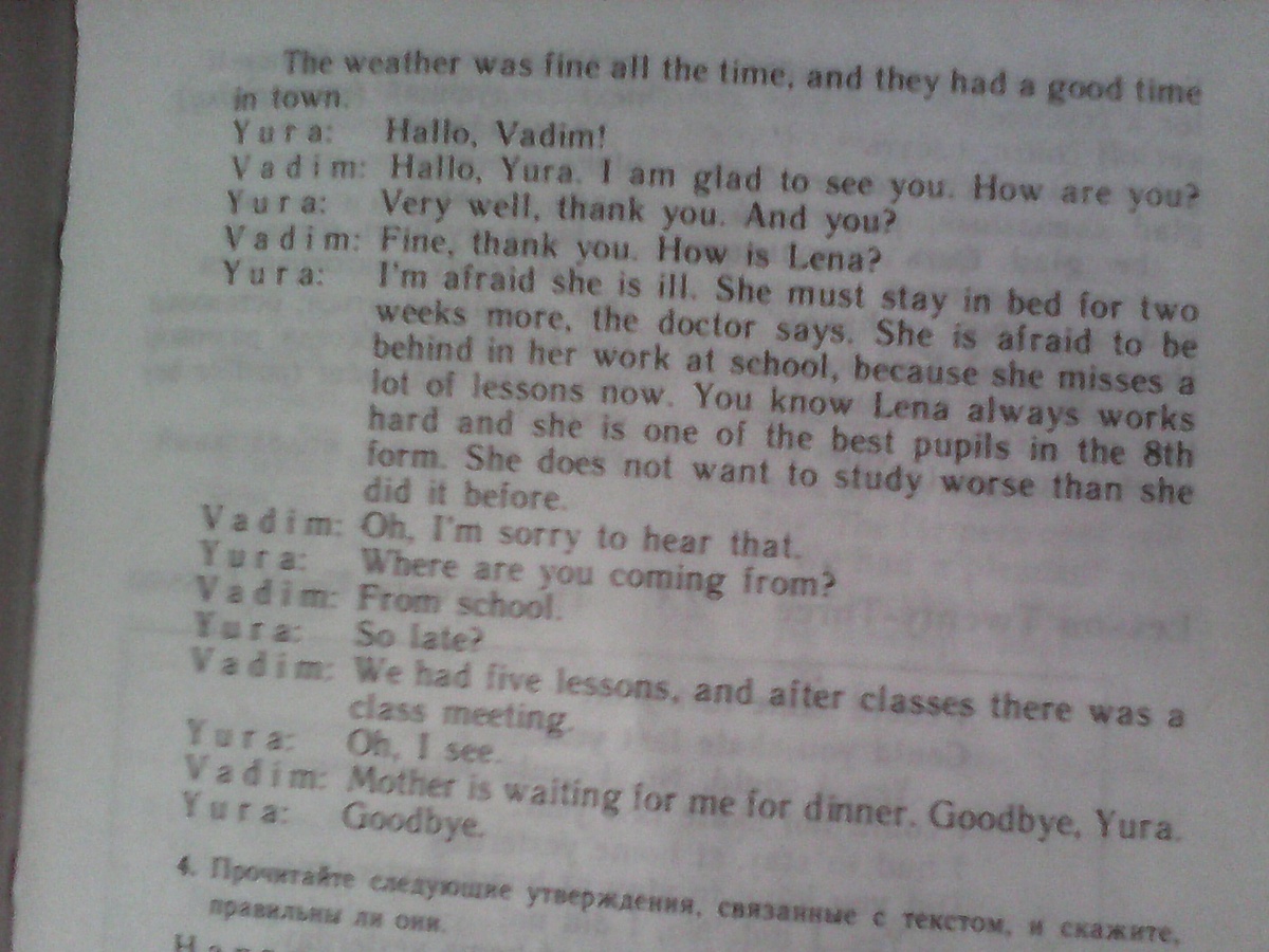 Ю: Я боюсь она заболела.Доктор сказал, что она должна оставаться в кровати больше двух недель.Она боится за свою работу в школе, потому что она пропускает много уроков. Ты знаешь,что Лена всегда работает усердно и она одна из лучших учениц 8 класса.Она не хочет пропускать занятия,пока не сделает это.