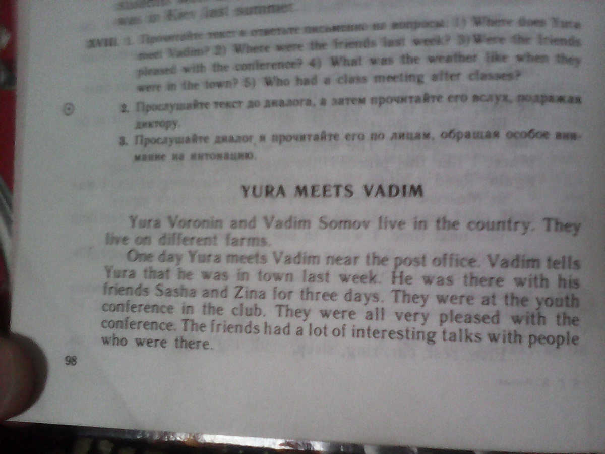 В один день Юра встретил Вадима около офиса.Вадим рассказал Юре о том,что был в городе на прошлой недели.Он был там с друзьями Сашей и Зиной три дня.Они были на конференции в клубе.Они получили огромное удовольствие от конференции.Друзья рассказали много интересного тем,кто там был.
