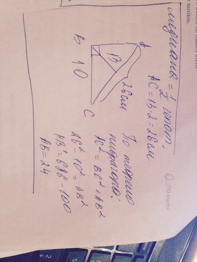 1. Катет прямоугольного равен 10 см, а медиана проведенная к гипотенузе - 13 см. Найди периметр треугольника.