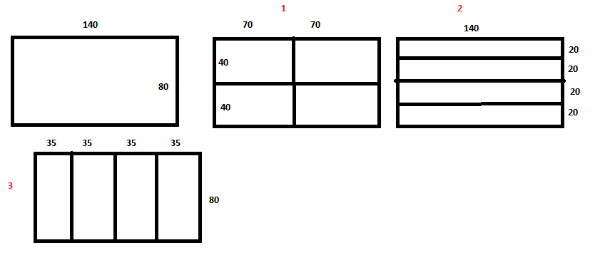 пойжайлуйста решите задачу прямоугольный участок земли длиной 140 м и шириной 80 м необходимо разделить на 4 одинаковых участка прямоугольной формы из двух предложенных вариантов выбери тот при котором длина изгороди будет наименьшей