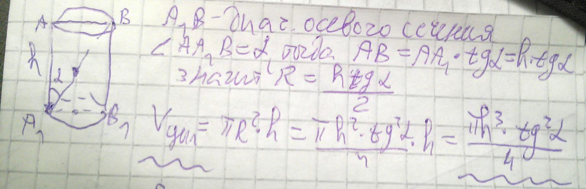 1) высота цилиндра равна h и составляет с диагональю осевого сечения угол альфа. Вычислите объем цилиндра.
