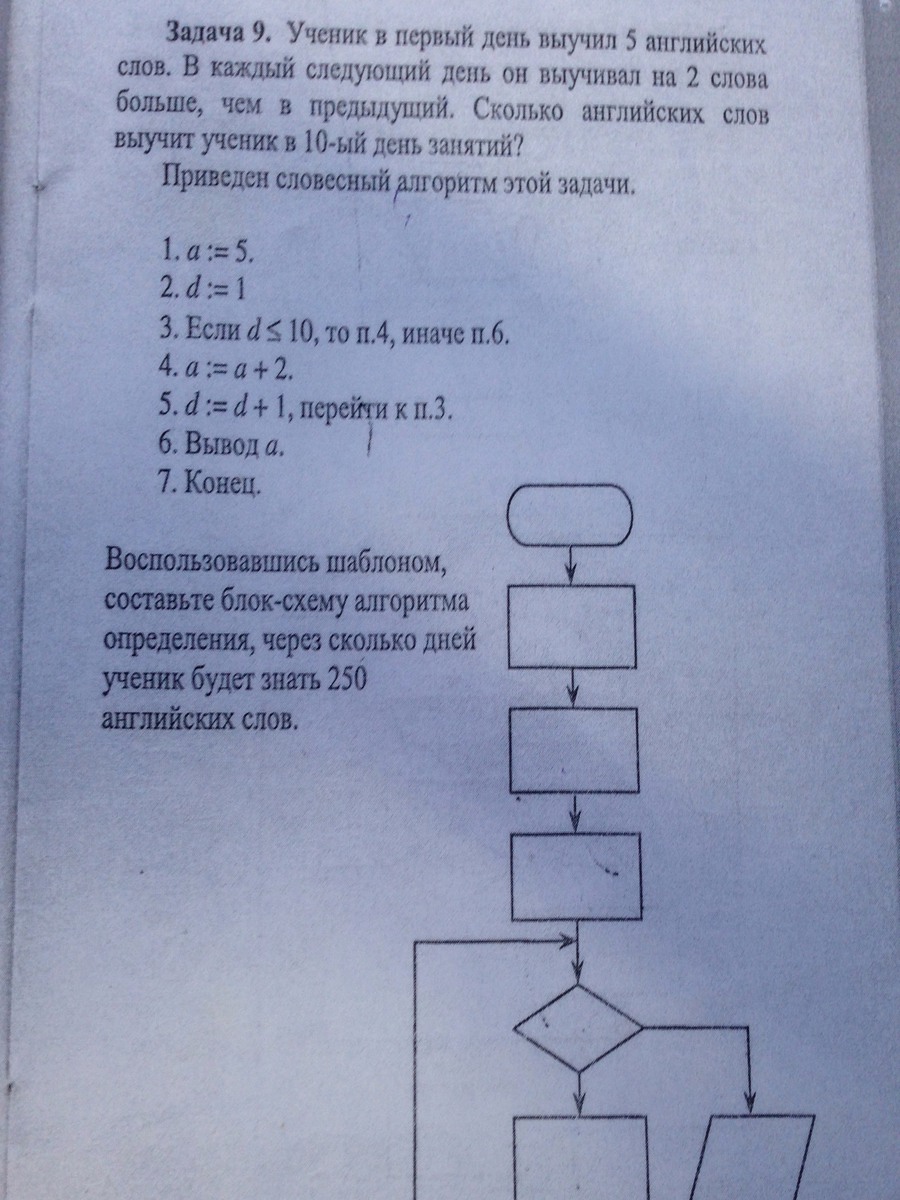 Воспользовшись шаблоном,составьте блок схему алгоритма определения ,через сколько дней ученик будет знать 250 англ.слов.