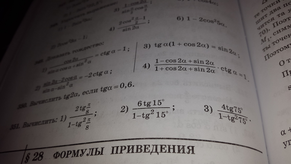 frac{2tgfrac{pi}{8}}{1-tg^2frac{pi}{8}}=tgfrac{pi}{4}=1\\frac{6tg15^0}{1-tg^215^0}=3tg30^0=3frac{1}{sqrt3}=sqrt3\\frac{4tg75^0}{1-tg^275^0}=2tg150^0=2tg(180^0-30^0)=2(-tg30^0)=frac{-2}{sqrt3}