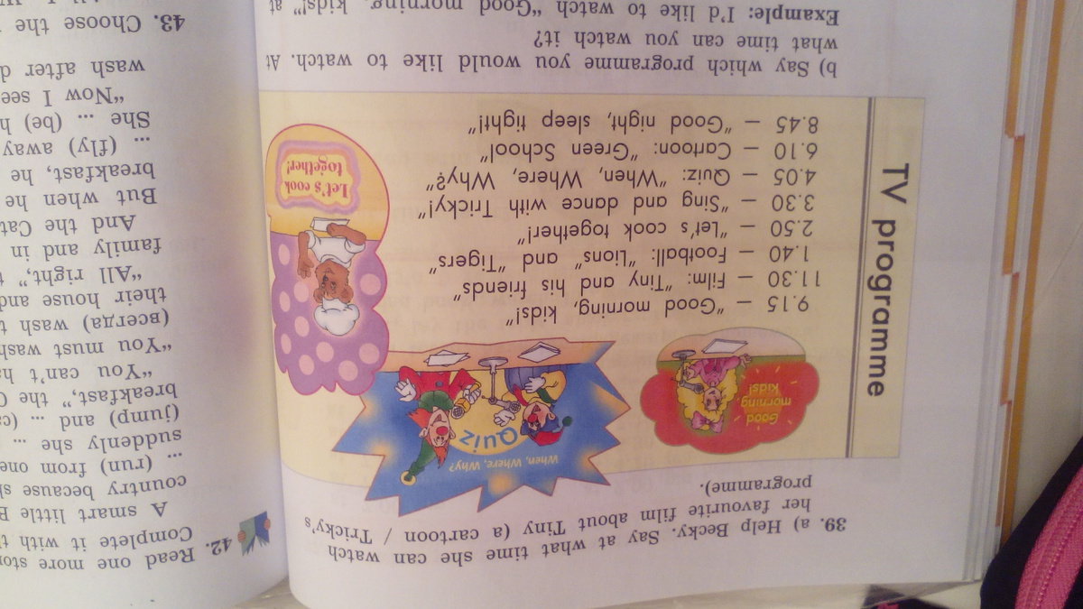 Тебе нужно написать во сколько Бэки может посмотреть её любимый фильм. Наверное, до этого был какой-нибудь текст, где говорилось о её любимом фильме. Например: " She can watch "Good morning, kids" at 9.15 o'clock.