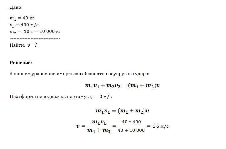 Снаряд массой 40 кг, летящий горизонтально со скоростью 400 м/с, попадает в неподвижную платформу с песком массой 10т и застревает в песке. С какой скоростью стала двигаться платформа?