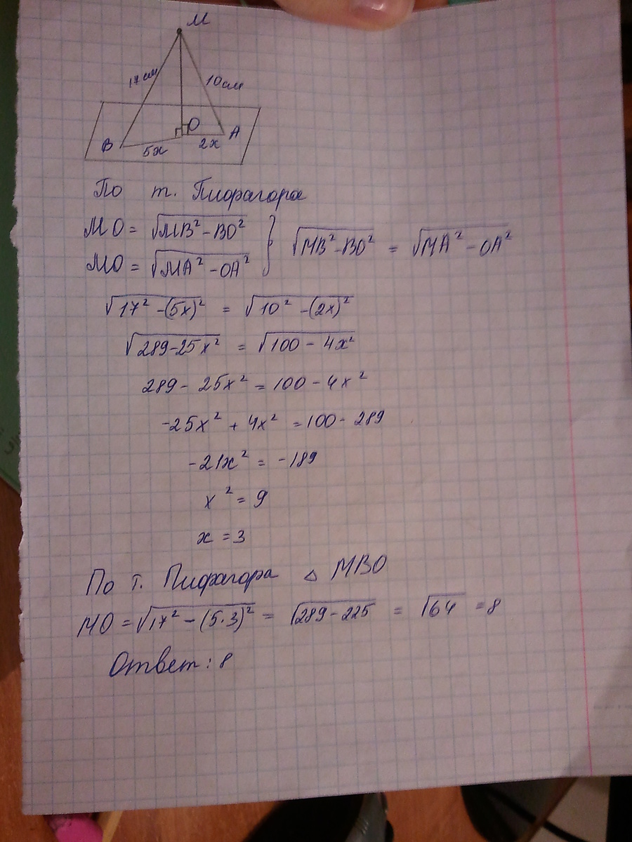 Из точки М к плоскости проведены перпендикуляр МО и две наклонных МА=10 см и МВ=17 см. Найти длину перпендикуляра, если длины проекций пропорциональны числам 2 и 5.