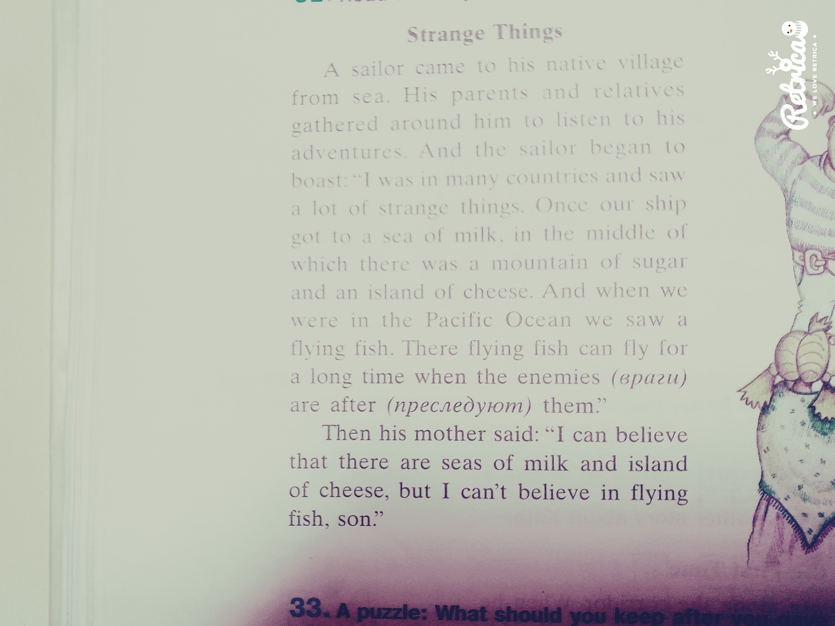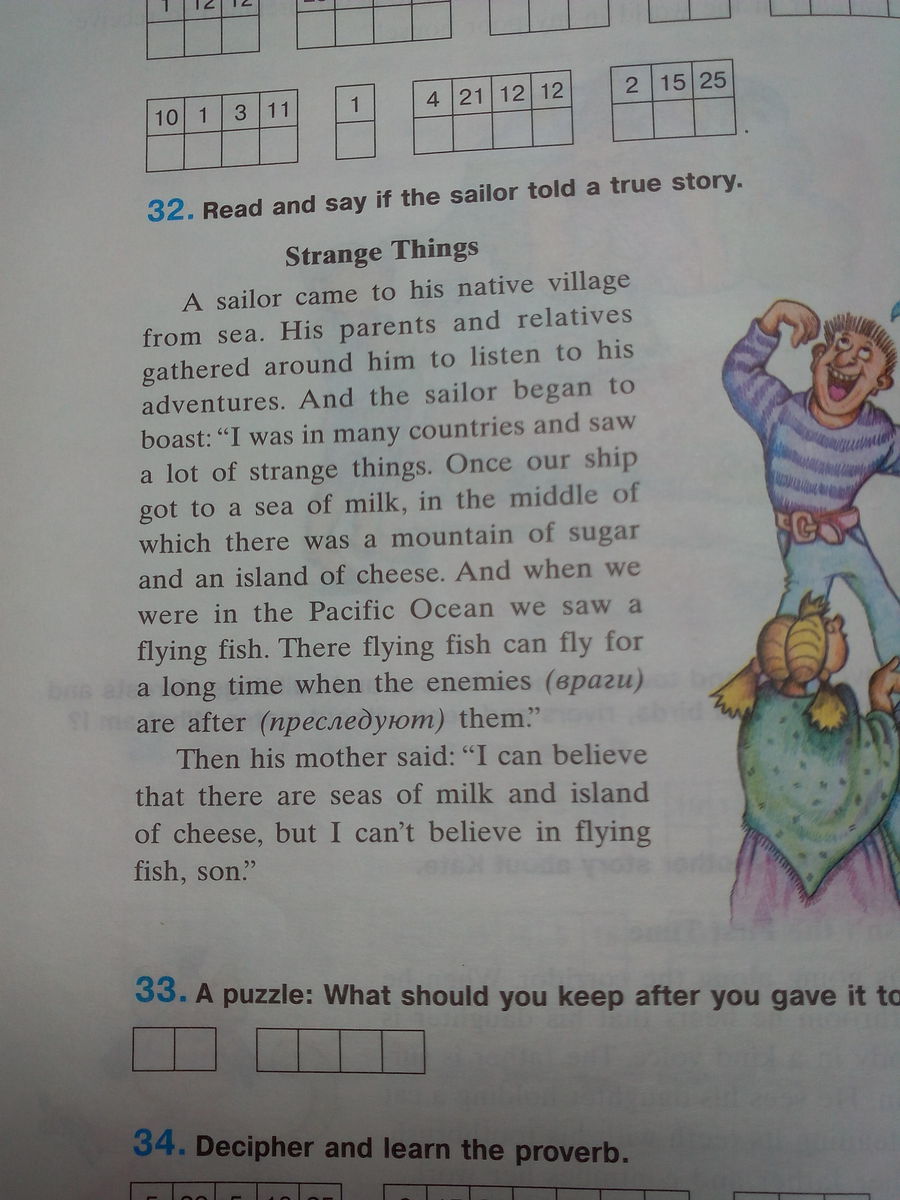 Моряк приехал в свою родную деревню с моря. Его родители и родственники, собравшиеся вокруг него, слушали о его приключениях. И моряк начал хвастаться: "Я побывал во многих странах и увидел много странных вещей. Однажды наш корабль попал в море молока, в центре которого были гора сахара и остров сыра. И когда мы были в Тихом океане, мы видели летающих рыб. Летающие рыбы могли летать долгое время, когда враги их преследовали".
