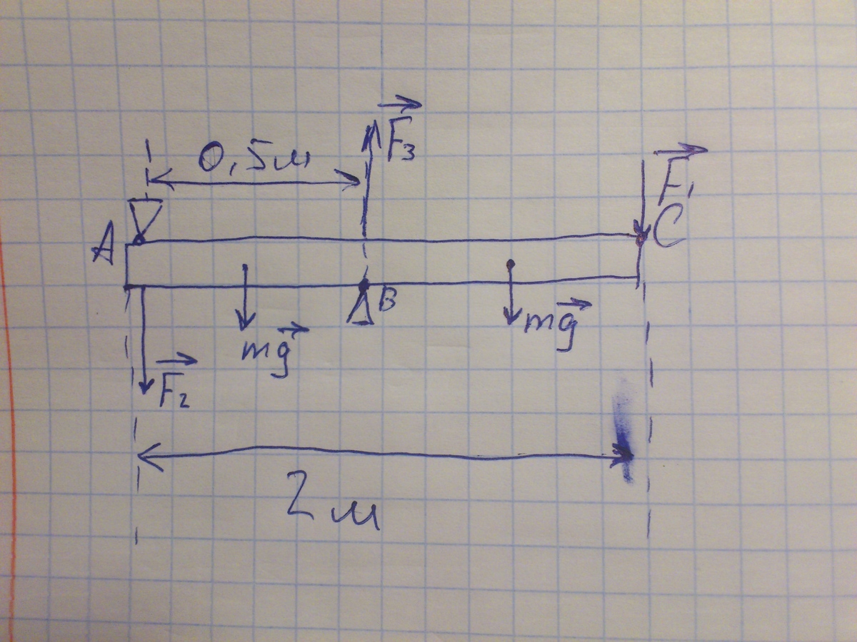 плита массой 1000кг и длиной 2 м удерживается на двух опорах А и В расстояние между которыми 0,5м. в точке С на опору действует сила 1000Н. Какова сила в точкеА? ПОМОГИТЕ ПЛИЗ!