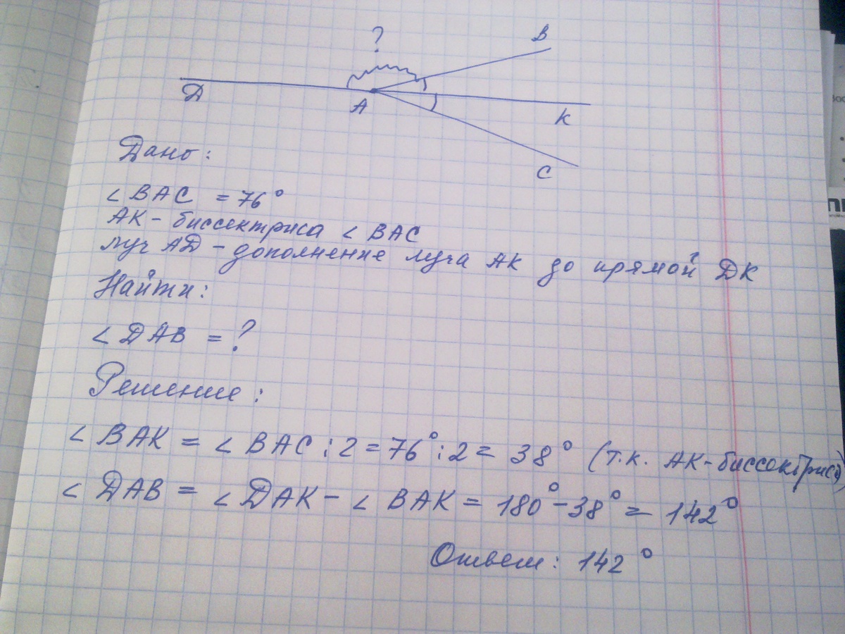 Найди величину угла ,образованного полупрямой,противоположной биссектрисе угла А,и стороной этого угла ,если m(угла А)= 76