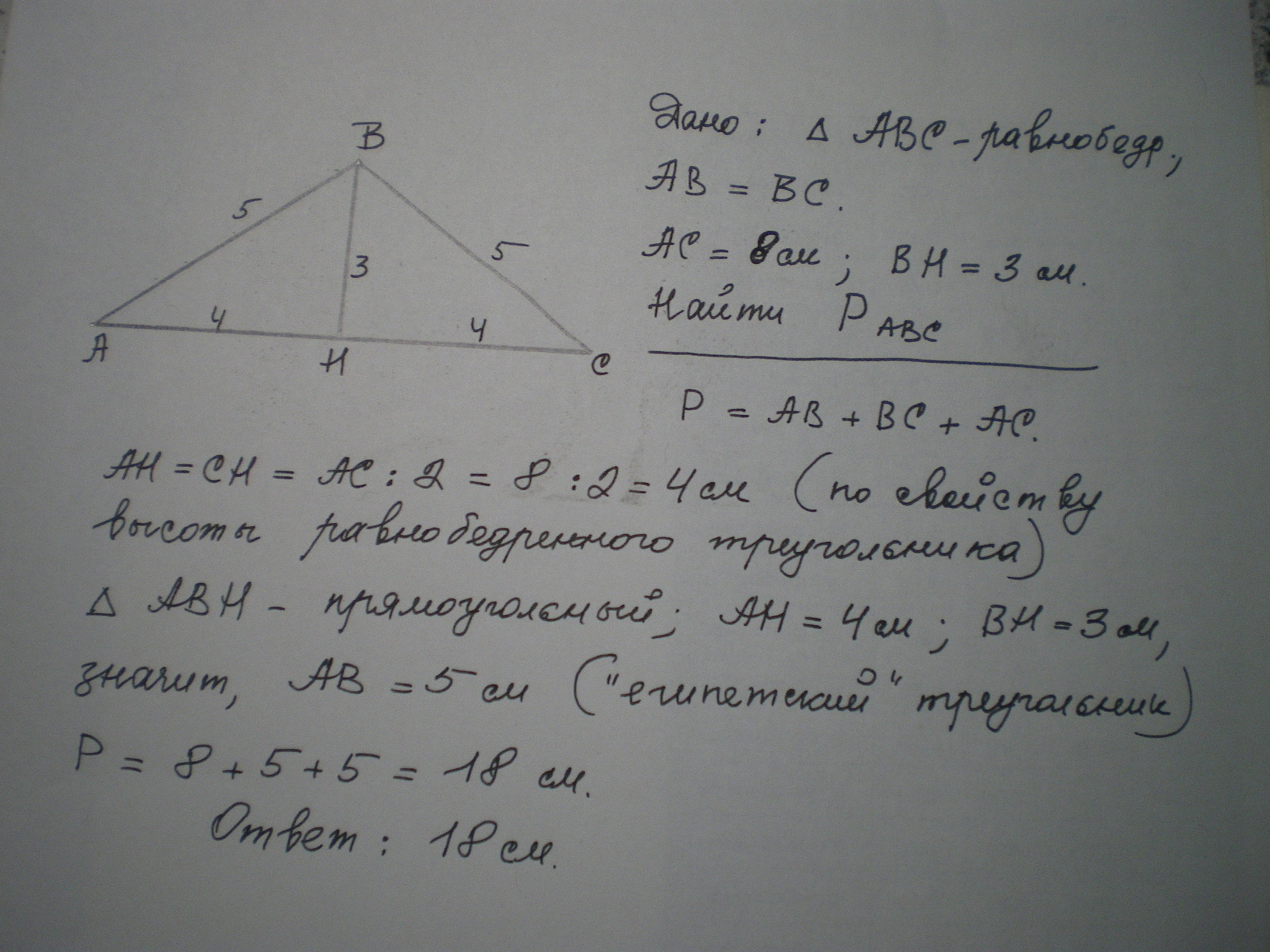 Основание равнобедренного треугольника равно 8 см, а высота, опущенная на основание, - 3 см. Найдите периметр треугольника. Помогите пожалуйста решить._.