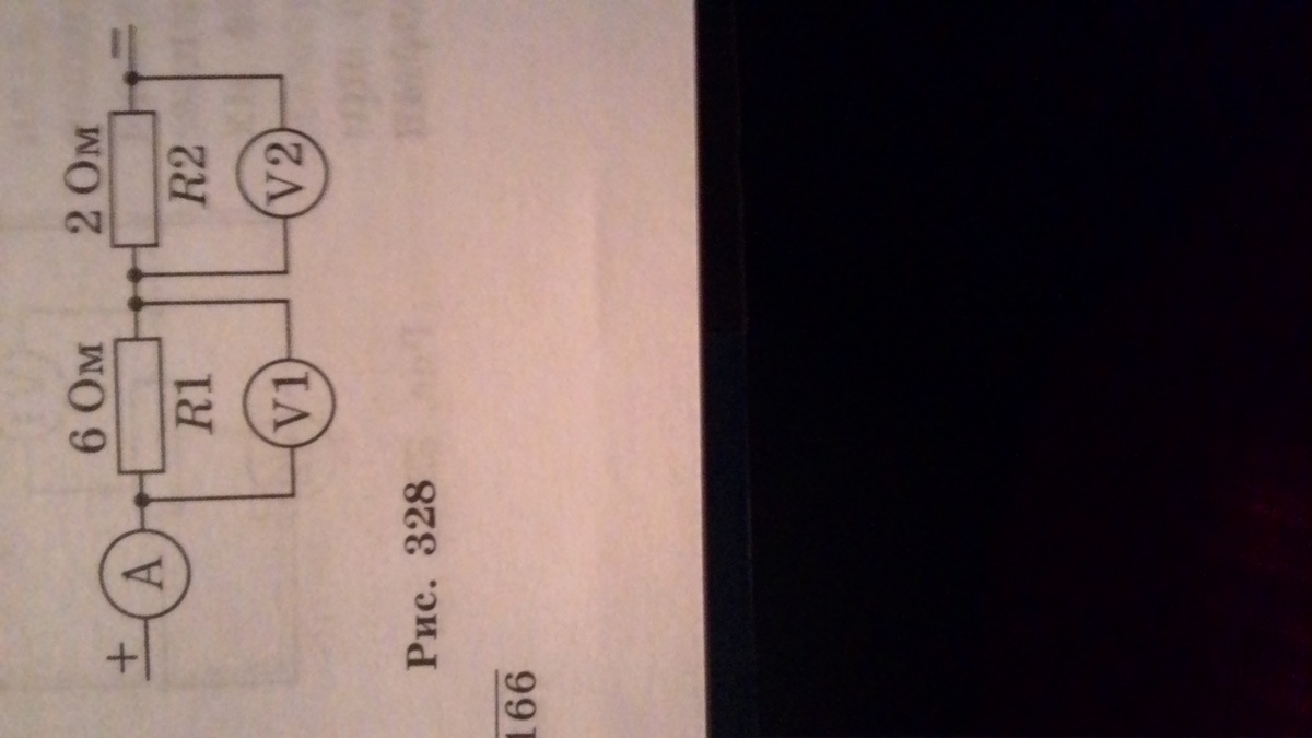 показание первого вольтметра 24В(рис 328). определите показания амперметра и второго вольтметра?