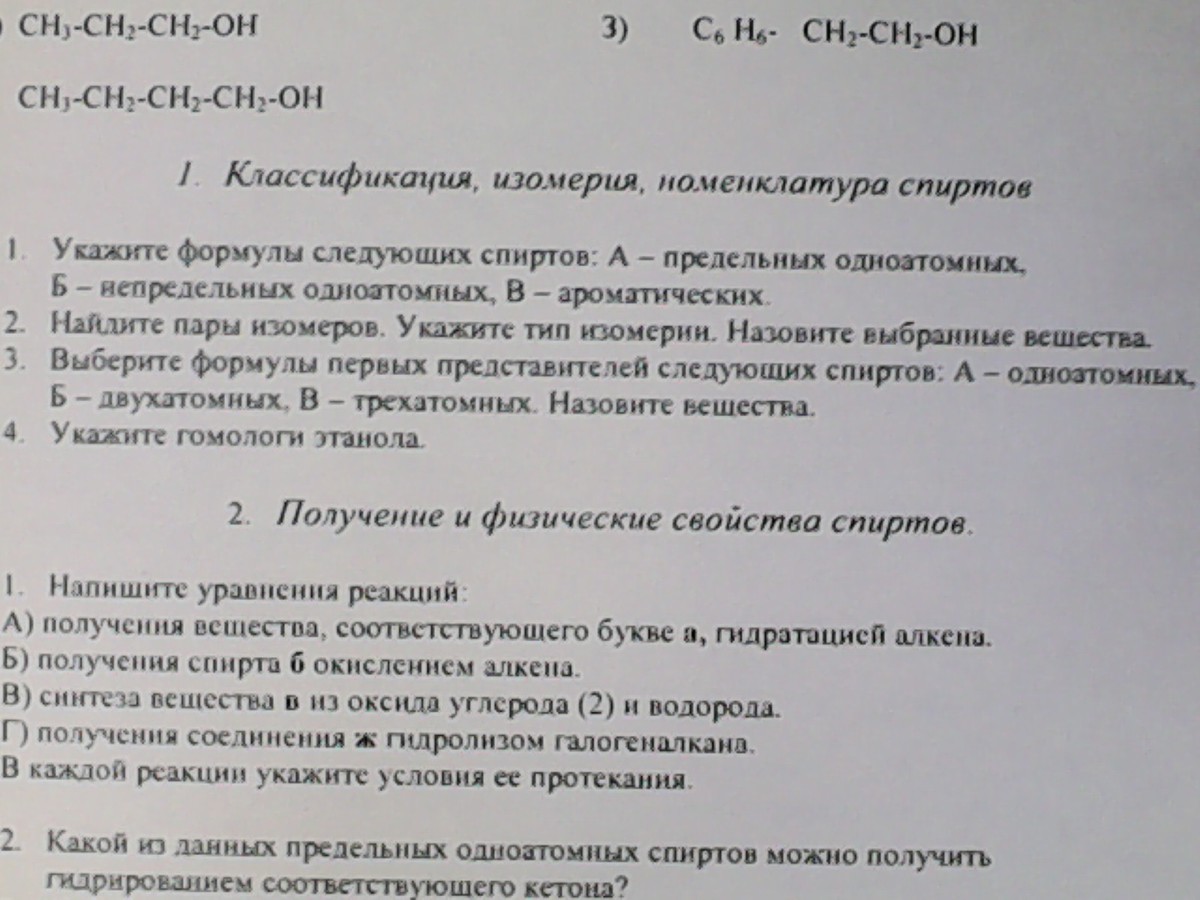 1. А - Предельно атомные - СH3- CH2-OH Б - неприедельно одноатомные - CH2=CH-CH2-OH В – ароматически – C6H5-CH2-OH