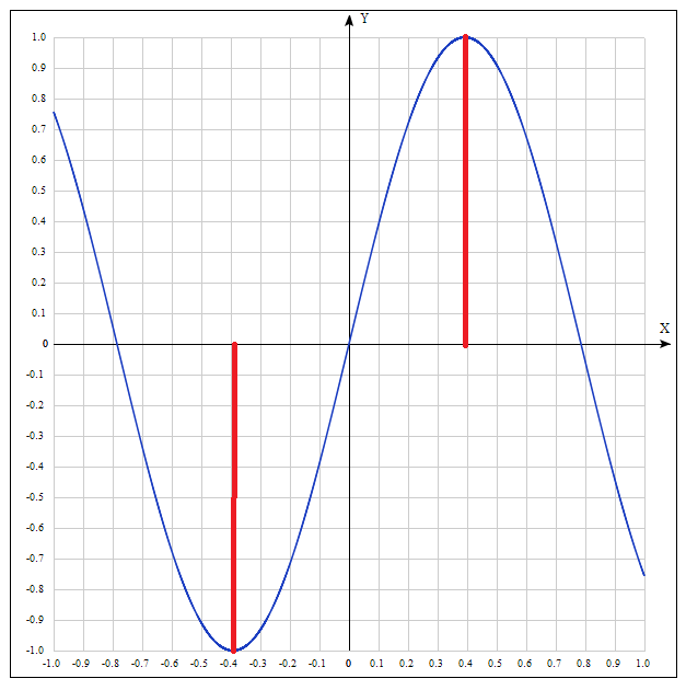 Вот такой график. По оси у в границах -1;1, пересечение по х -0,4;0,4