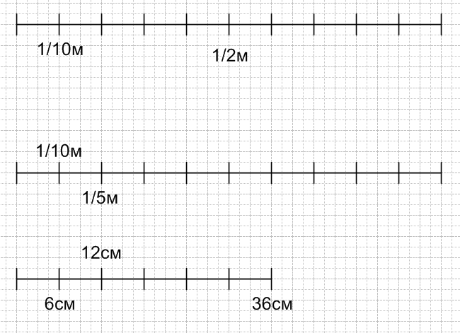 в) Длина первого отрезка равна 6см, что составляет 1/2 длины второго отрезка. Длина третьего отрезка составляет 1/3 длины второго отрезка. Начерти эти отрезки.