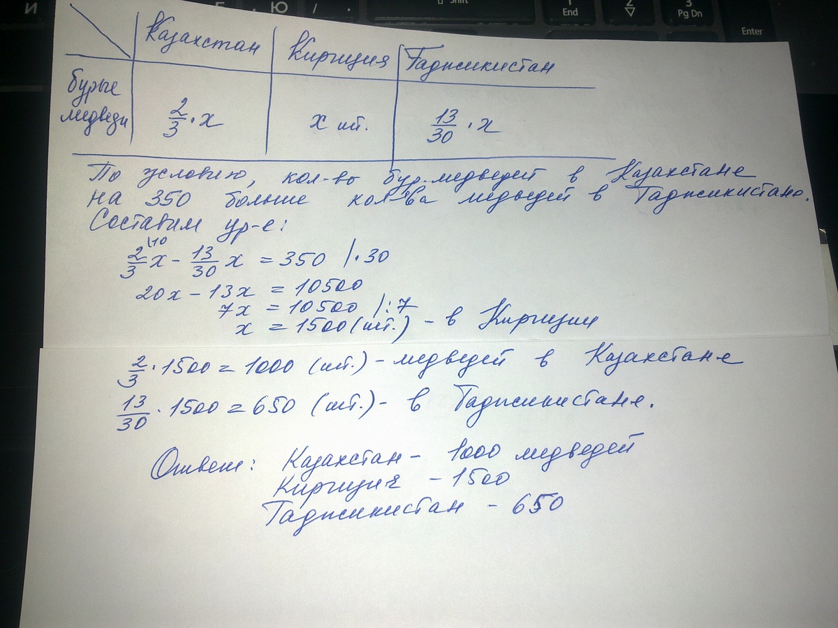 количество бурых медведей казахстана составляет 2/3 часть бурых медеведей кыргызстана, а в таджикистане 13/30 часть от бурых медеведей кыргызстане. если наши бурые медведи больше на 350 от таджикистана, сколько медведей в этих сттранах