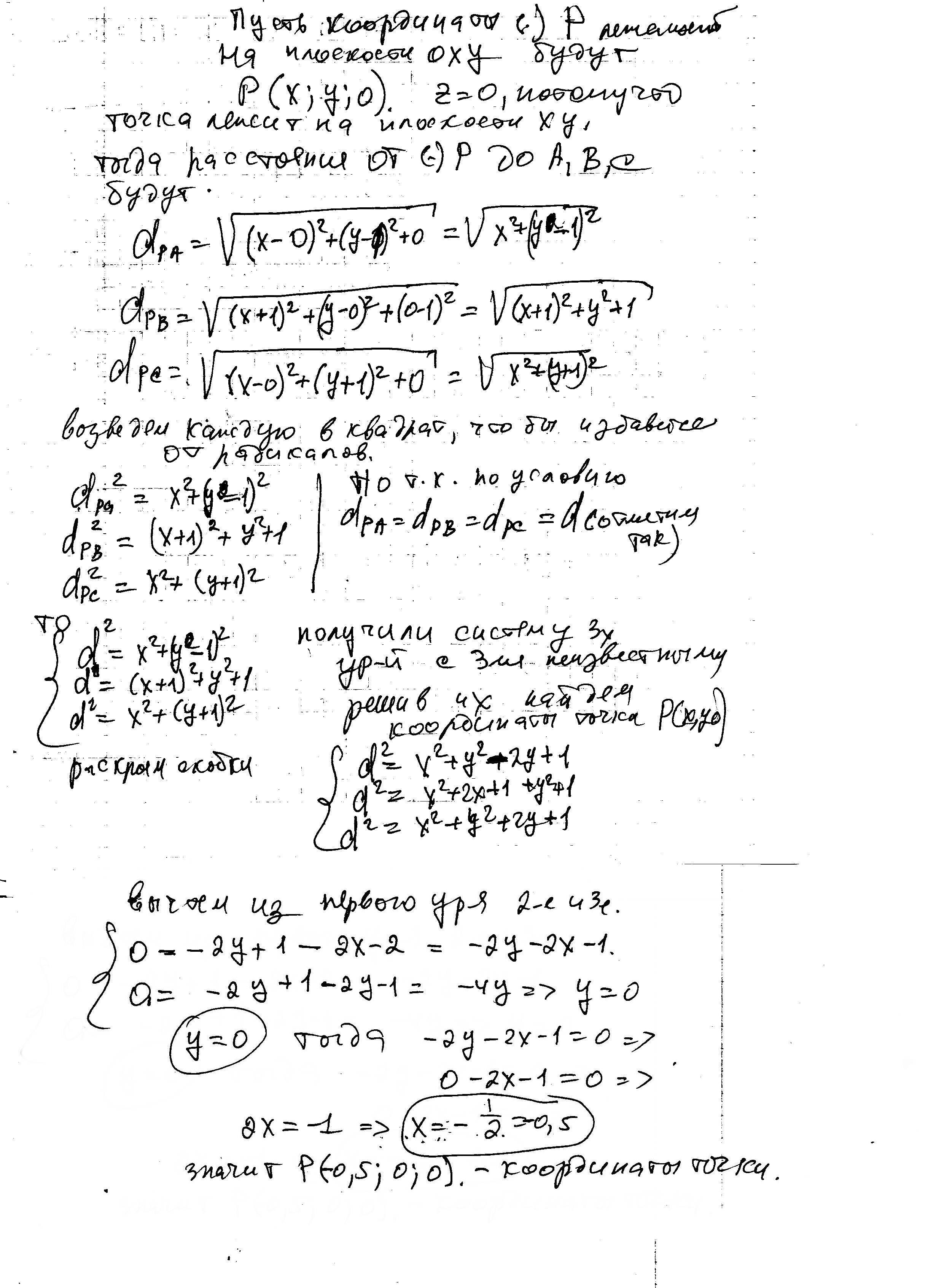 Найдите координаты точки, лежащей в плоскости xy и равноудаленной от точек A (0;1;0), B (-1;0;1), С (0;-1;0)