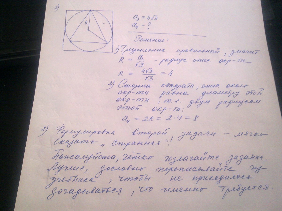 1.Правильный треугольник вписан в окружность, a3 = 4 корня из 3. Найти сторону квадрата, описанного около этой же окружности.