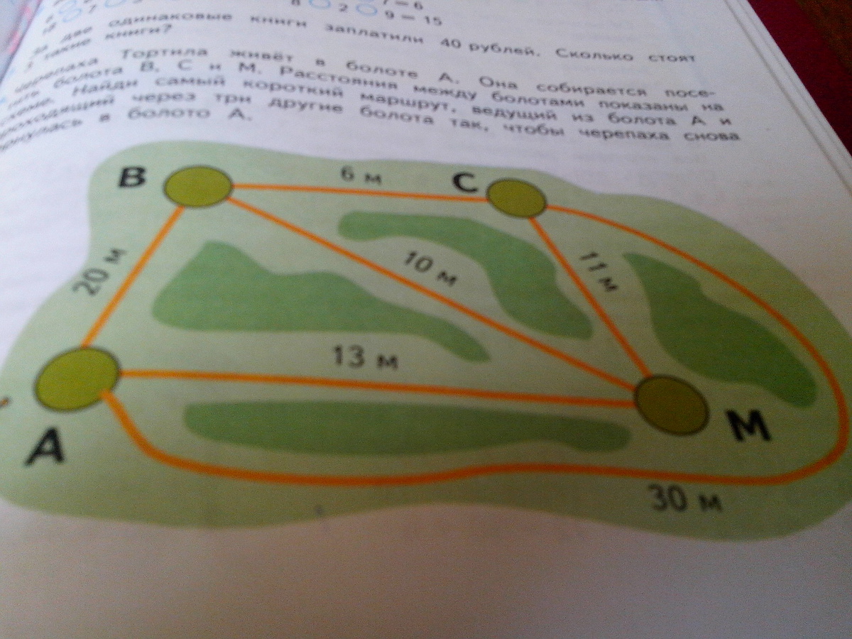 Думал, что самый короткий маршрут будет ABCBMA. Потому что путь, по которому 2 раза проходим - самый короткий 6 м. Все пути по одному разу здесь не пройти. Но я ошибся, их и не надо все по одному проходить. Да, правда, самый короткий будет АВСМА или АМСВА.
