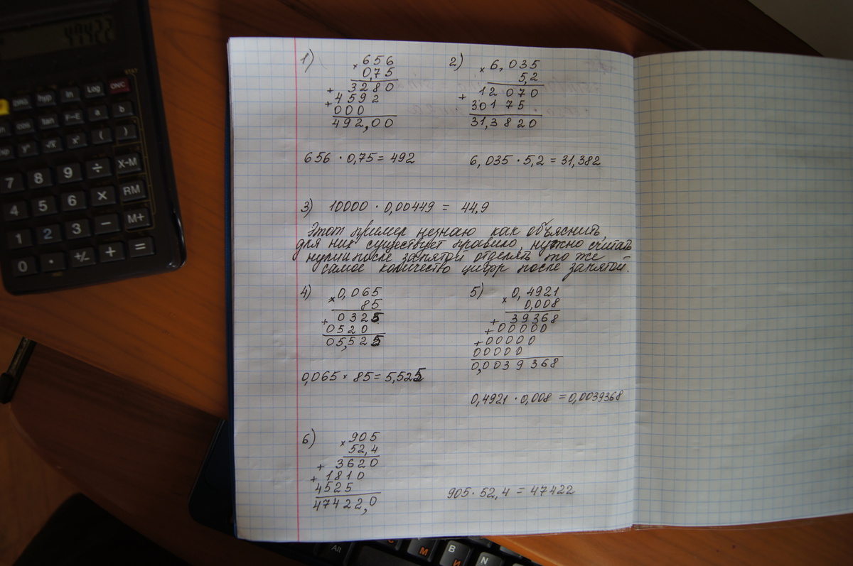 1) 656*0.75 2) 5.2*6.035 3) 10000*0.00449 4) 0.065*85 5) 0.4921*0.008 6) 905*52.4 а остальное я попробую сам другие 6 примерев хотя покажите примеры как их делать пожалуйста