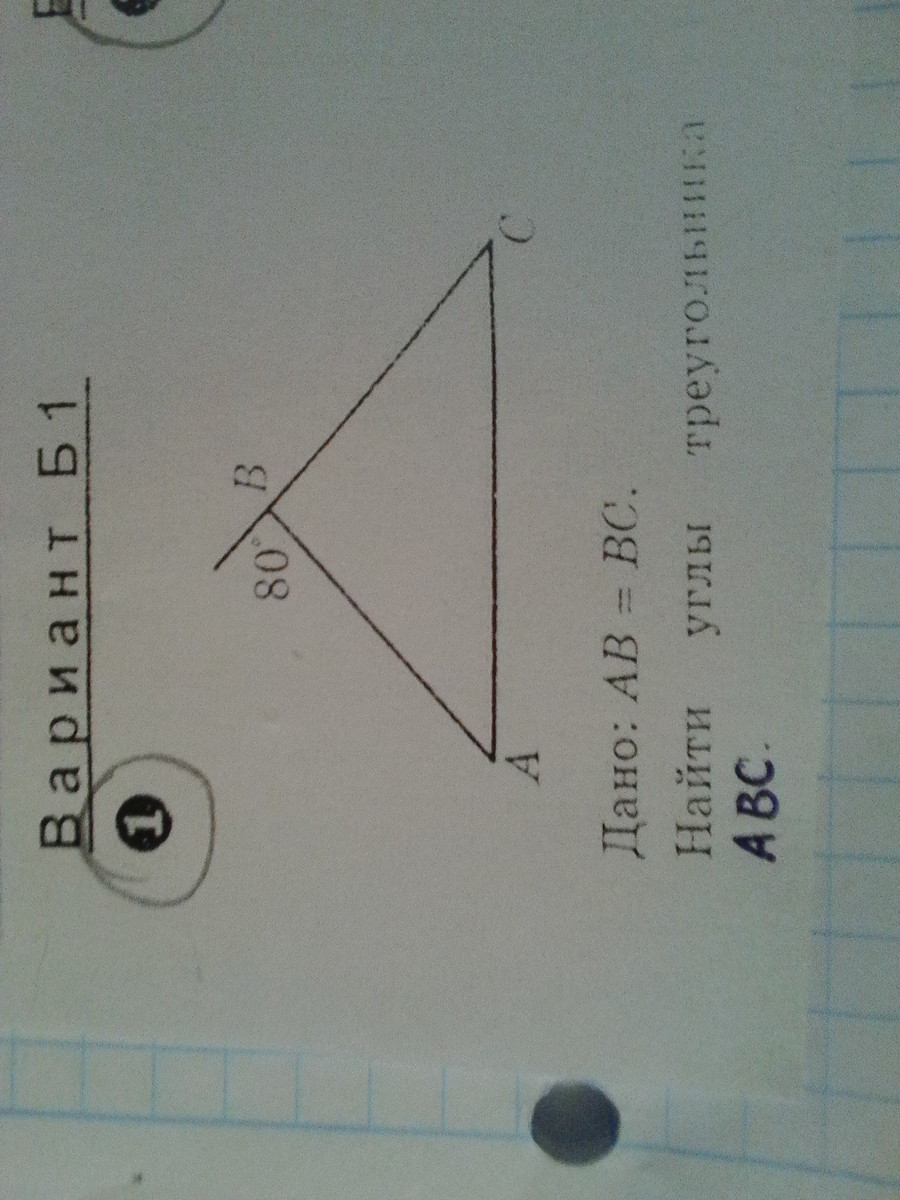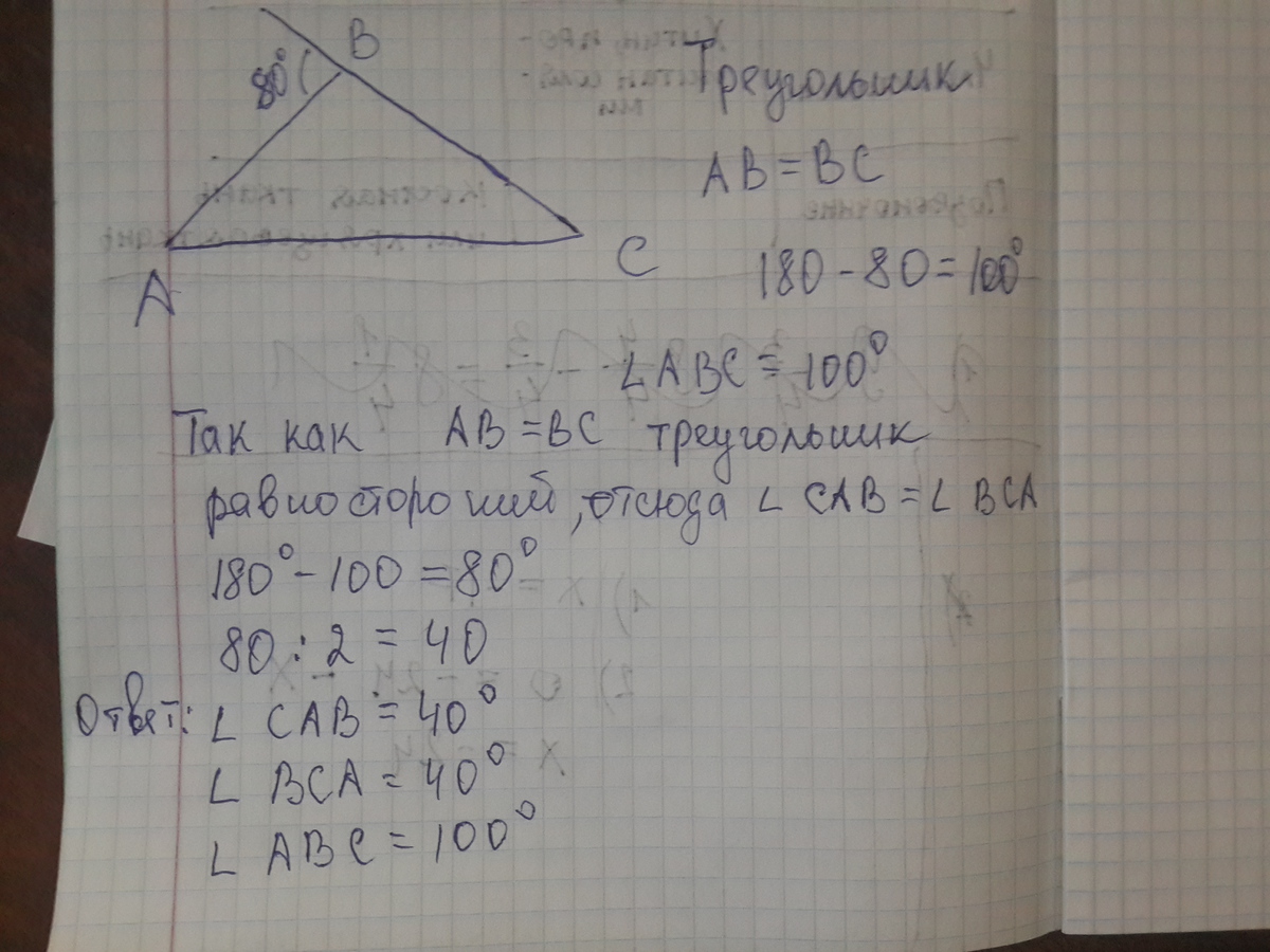 угол ABC=180-80=100 угол A=углу С =x тогда x+x+100=180 x=40 уголA=С=40 угол АВС=100