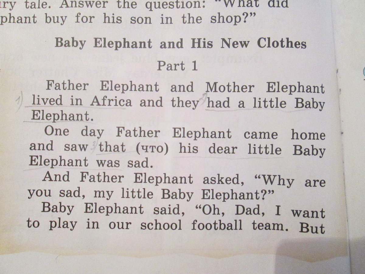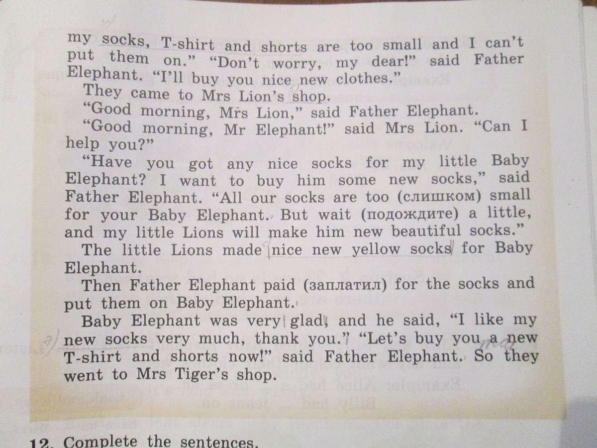 Africa and they had a little Baby Elephant. One day Father Elephant carne home and saw that (что) his dear little Baby Elephant was sad. And Father Elephant asked, "Why are you sad, my little Baby Elephant?" Baby Elephant said, "Oh, Dad, I want to play in our school football team. But my socks, T-shirt and shorts are too small and I can't put them on." "Don't worry, my dear!" said Father Elephant. "I'll buy you nice new clothes." They came to Mrs Lion's shop. "Good morning, Mrs Lion," said Father Elephant. "Good morning, Mr Elephant!" said Mrs Lion. "Can I help you?" "Have you got any nice socks for my little Baby Elephant? 1 want to buy him some new socks," said Father Elephant. "All our socks are too (слишком) small for your Baby Elephant. But wait (подождите) a little, and my little Lions will make him new beautiful socks." The little Lions made nice new yellow socks for Baby Elephant. Then Father Elephant paid (заплатил) for the socks and put them on Baby Elephant. Baby Elephant was very glad, and he said, "I like my new socks very much, thank you." "Let's buy you a new T-shirt and shorts now!" said Father Elephant. So they went to Mrs Tiger's shop.