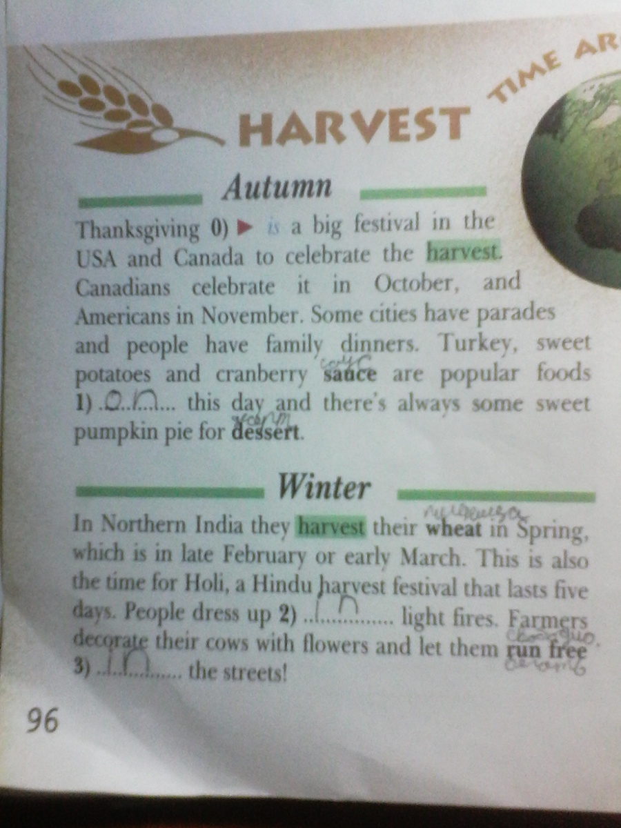 В северной Индии они собирают пшеницу весной, либо в конце Фераля, либо рано в Марте. Это также день Холли, индуисткого праздника урожая, которые длится 5 дней.Люди одеваются в яркие ( не знаю что такое fires)Фермеры украшают своих коров цветами и дают им побегать на свободе по улицам