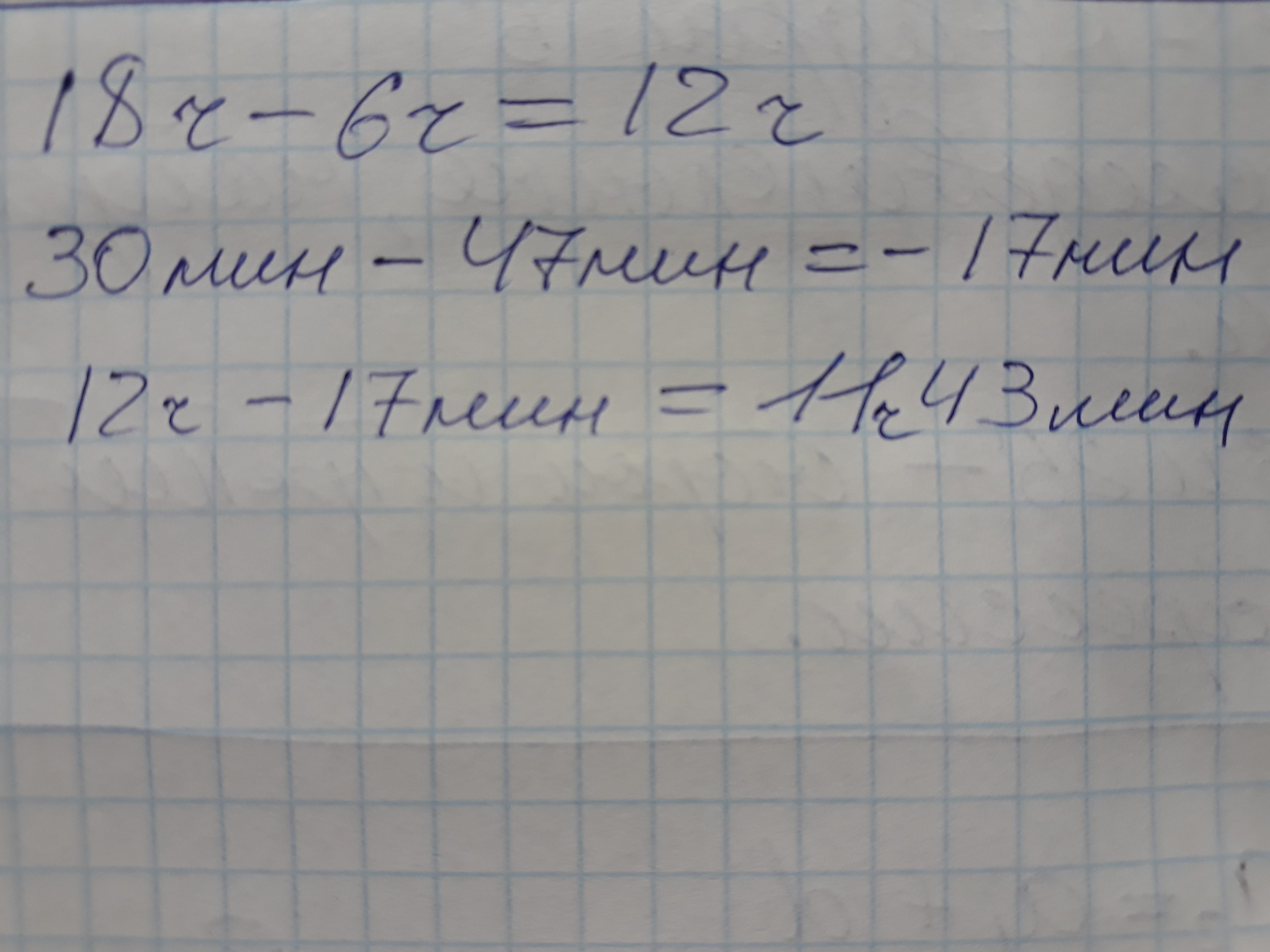 В Новосибирске в марте солнце восходит в 6 ч 47 мин, а заходит в 18 ч 30 мин. Вычисли продолжительность светового дня в Новосибирске в марте.